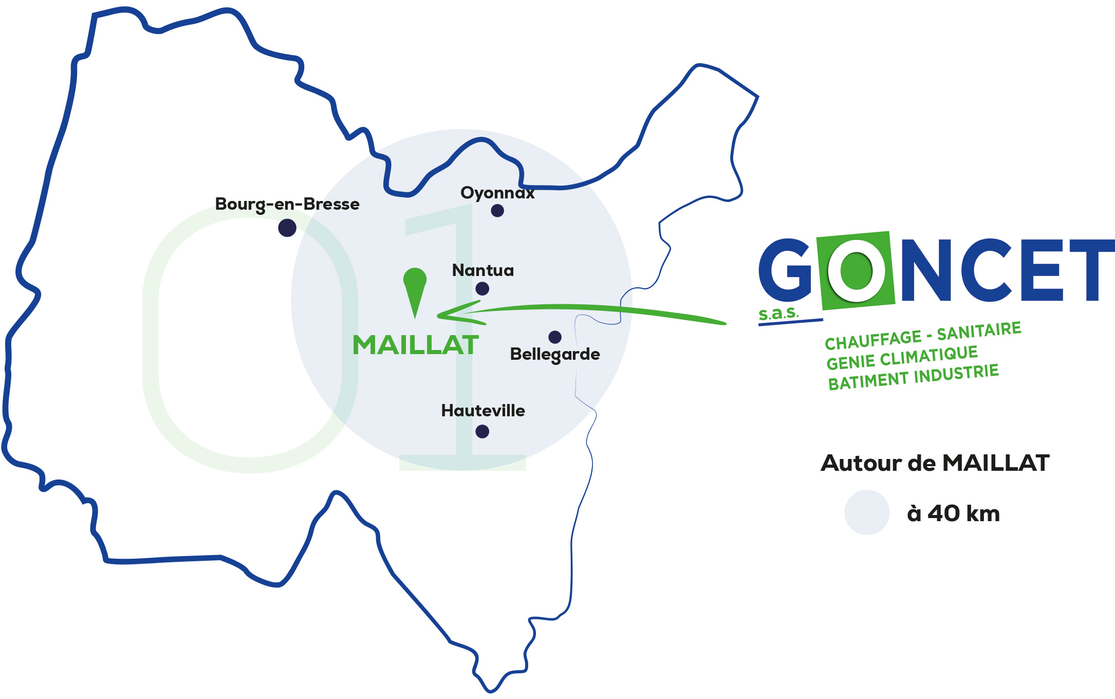 La SAS GONCET située à MAILLAT intervient sur l’ensemble du Haut Bugey ainsi que sur le Haut Valromey et ses alentours, dans un rayon d’environ 40 km autour de Maillat. Grâce à son implantation locale, l’entreprise assure des prestations de proximité à Montréal-la-Cluse, Nantua, Oyonnax, Hauteville et Chézery, ainsi que dans les communes environnantes.